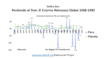 Tengámoslo muy presente. A pesar de que esto también se ha borrado de la historia económica oficial peruana, ni siquiera hemos recuperado los seis puntos del producto por persona de un norteamericano perdidos en esa hedionda dictadura de izquierda (ver gráfico cuatro, más adelante).