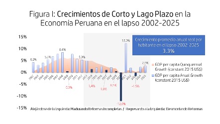 Volviendo a casa. No resulta casual que –después de una década de caviarada y filosenderismo– el crecimiento económico peruano resulte inestable y magro (ver figura I). Nuestros últimos veintitantos años –lapso en el que la opresión resultaría mucho menor a la registrada en los aciagos días de la izquierda populista y el velascato– confirman que nuestro crecimiento de largo plazo (3.3%)  nos aleja del mundo desarrollado.