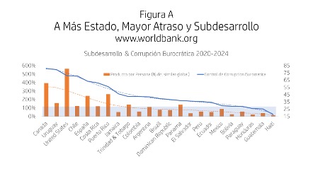 Si comparamos los valores promedio quinquenales publicados, desde Canadá hasta Haití, se es mucho más pobre cuando el aparato burocrático es más corrupto. Y se es más burocráticamente corrupto cuanto más grande es el botín y menores las libertades de la plaza. La clave aquí no implica solamente comprender que la asociación global, entre las cifras de corrupción burocrática y los niveles de riqueza por persona, resulta estadísticamente sólida, sino que, bajo los mismos valores de gobernanza estatal publicados por el Banco Mundial, la corrupción burocrática erosiona la eficacia de su gasto y reglas.