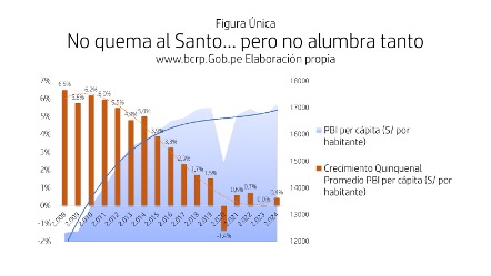 Este gráfico resume una realidad incómoda: no es cierto que el país crezca a un ritmo destacable ni disponga hoy de abundantes recursos fiscales. Tengámoslo muy claro, la economía peruana crece anualmente alrededor del 3%. (cerca del 1,5% por persona). Su promedio quinquenal bordea apenas el 1% anual per cápita.