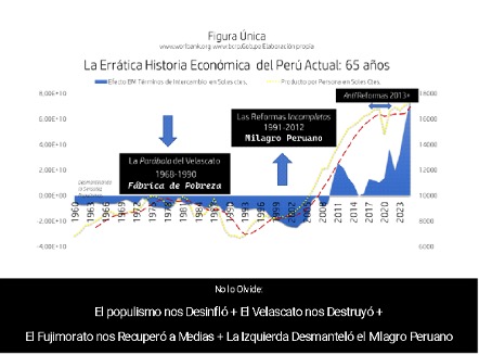 El gráfico único de este artículo, contrasta la imagen de una nación que se infla, pero persiste rezagada y empobrecida. Justamente por su falta de capitalismo. Por su falta de respeto al pueblo. En el Perú, en las últimas siete décadas, nos ha gobernado una recua de regímenes socialistas-mercantilistas que, o profundizaron sus grado de abuso (dictadura); o lo trataron de reducir timoratamente (reformistas a medias); o lo intentado profundizar de nuevo (caviarismo antirreformistas).