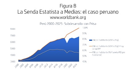 El caso del Perú reciente (plaza que ha optado por regresar a las recetas estatistas desde hace más de una década) nos resulta aquí de particular utilidad. También nos serviría enfocar la debacle económica española de las últimas décadas, pero el espacio conspira contra este deseo. Enfoquemos pues al Perú solamente, en la Figura B.