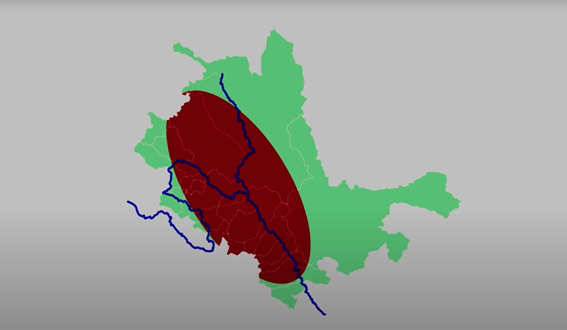 VRAEM (en verde) y zona de influencia del Militarizado PCP antes del 2003 (en rojo)