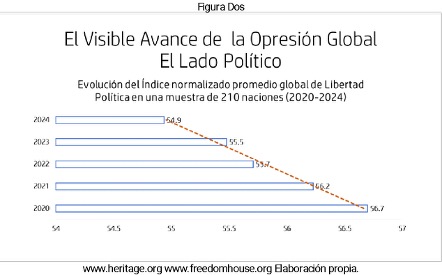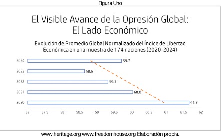En estas líneas haremos lo que decimos. Y en la figura Uno –usando los reconocidos índices de libertad económica publicados por la Heritage Foundation para una muestra de 174 naciones en promedios quinquenales– encontramos que el periodo 2020-2024 muestra un claro salto global hacia la izquierda económica. No solo hay mucha Izquierda, sino más izquierda.