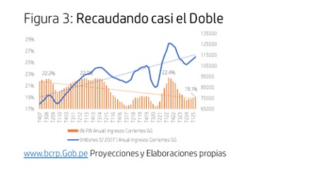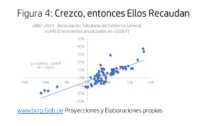Usando como metáfora la destructiva bomba de toda moda en el conflicto en Oriente Medio, la data peruana reciente (ver Figura 4) conecta los dos planos de estas líneas. En el Perú hoy se recauda grosso modo la misma presión tributaria –al menos– desde hace más de cinco décadas y el gran predictor es el PBI.