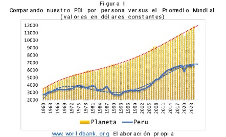 Pero hay algo más… La llamada “gran divergencia“ –i.e. la creciente distancia entre la riqueza de naciones desarrolladas y subdesarrolladas– se aplica al Perú con algo de encono. No solamente nuestro producto por persona se aleja consistentemente de los del primer mundo. En nuestro caso caemos más abajo. Nos alejamos consistentemente hasta del promedio mundial.